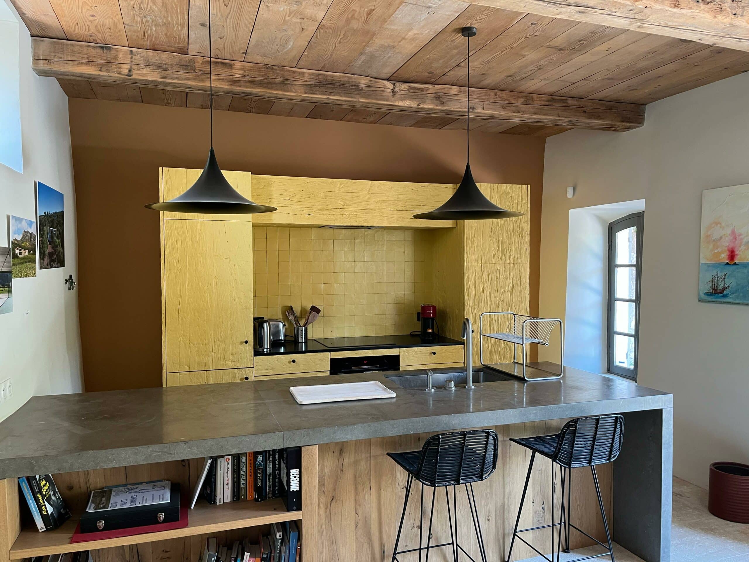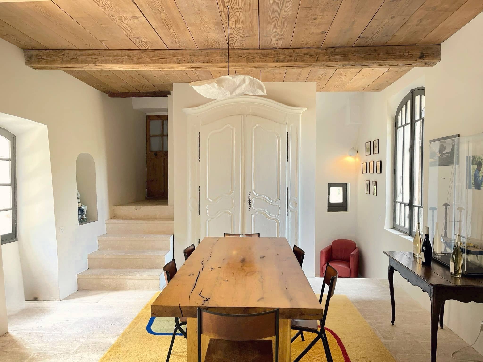 Le Mas des Auffes, bâtisse du XVIIᵉ siècle, s’étend sur plusieurs demi-niveaux et a su conserver tout le cachet d’antan : poutres apparentes, pierres au sol, cheminées… Chaque espace a été pensé pour offrir à la fois chaleur et raffinement.
